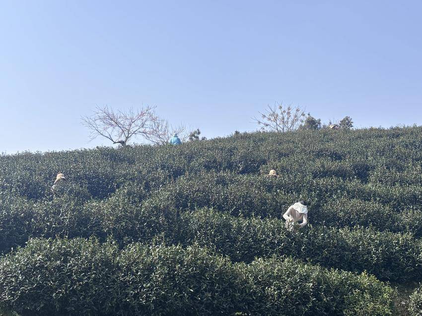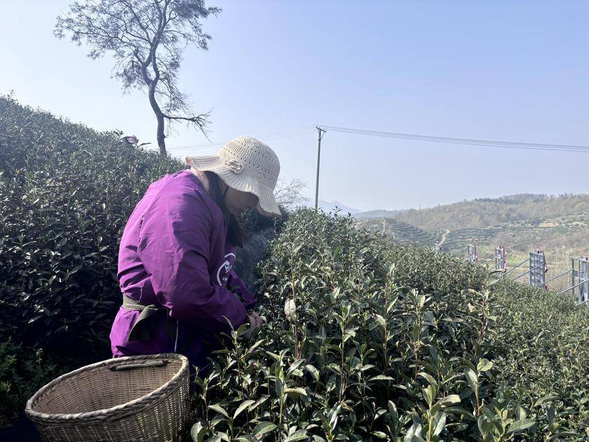 “采了6年茶,讲究眼疾手快,‘一叶一芽’不带底梗,茶才好看、好喝。”李艳霞边说着,手里的活计一刻不停。她身后,300余名采茶工散布在茶垄间,抢抓一年的“黄金时刻”。